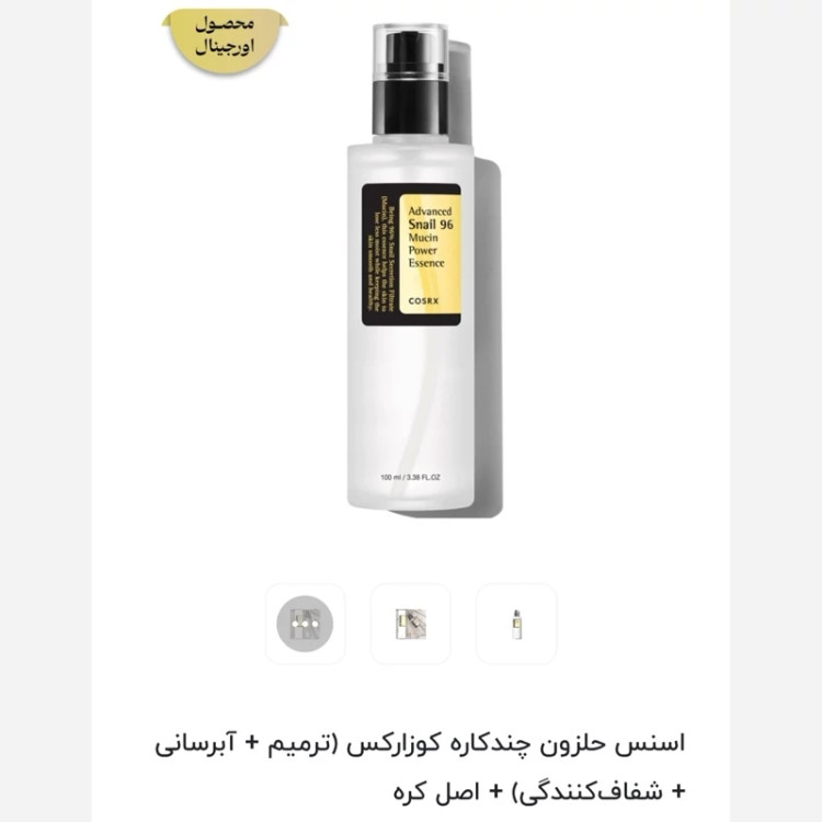 اطلاعات محصول نام فارسی محصول: اسنس جوانساز و ضد چین و چروک قوی کوزارکس با عصاره حلزون نام انگلیسی محصول: COSRX Advanced Snail 96 Mucin Power Essence نوع محصول: اسنس صورت عملکرد اصلی: ترمیم پوست، آبرسانی عمیق، بهبود بافت پوست استفاده در روز / شب: روز و شب مدت زمان اثرگذاری: 2–4 هفته مناسب برای سن: 20 سال به بالا مناسب برای نوع پوست: همه نوع پوست، بهویژه خشک و حساس جنسیت مصرف کننده: خانم/ آقا ترکیبات اصلی: 96٪ عصاره موسین حلزون، هیالورونیک اسید، پانتنول، آلانتوئین، آرژنین فاقد پارابن: بله فاقد الکل: بله فاقد عطر مصنوعی: بله فاقد سولفات: بله فاقد گلوتن: بله حجم / وزن: 100 میلیلیتر کشور سازنده: کره جنوبی محصولات مکمل: کرم حلزون کوزارکس، تونر آبرسان، سرم ویتامین C توضیح کوتاه: اسنس سبک و بدون چربی با جذب سریع، مناسب برای ترمیم و جوانسازی پوست.